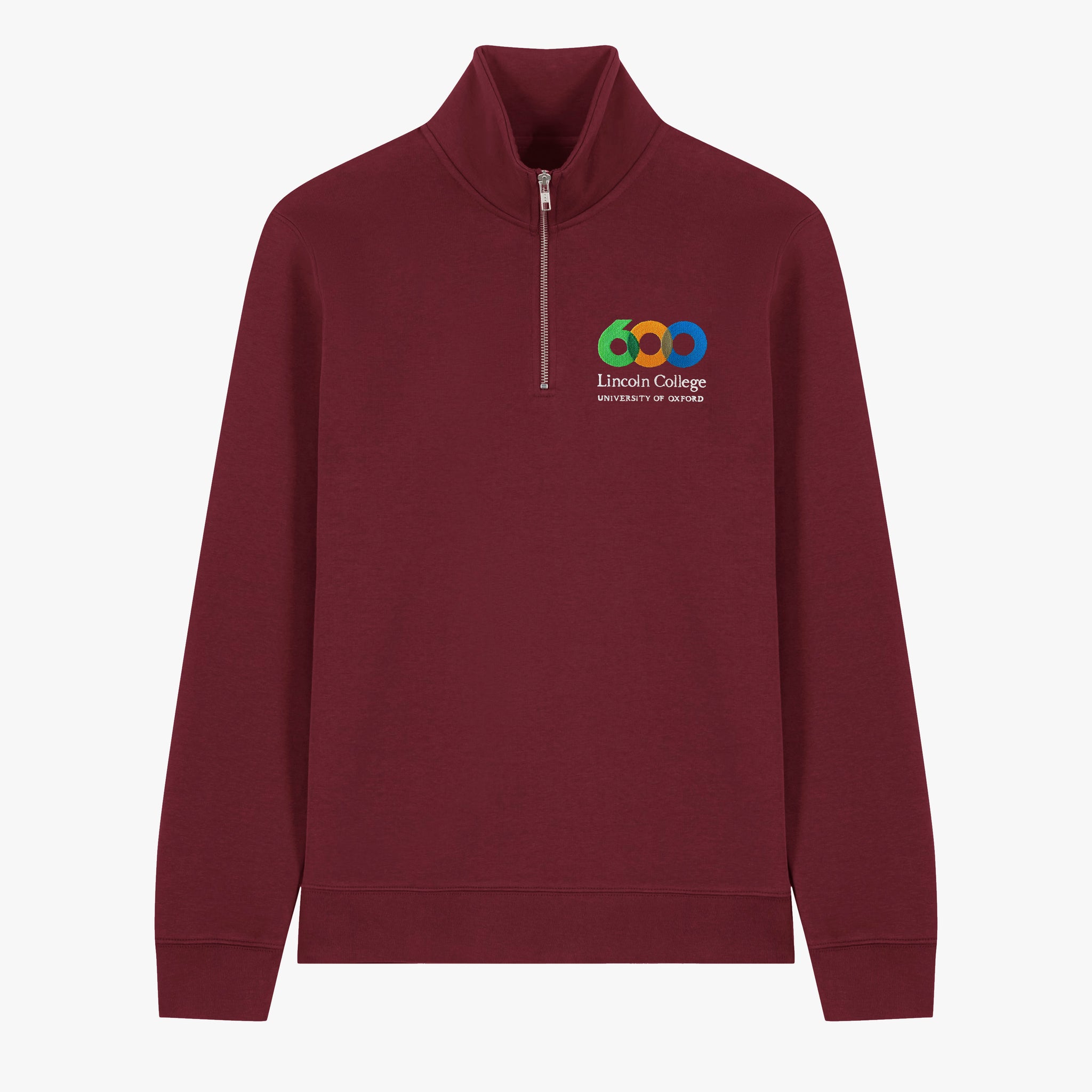 Evoking the quiet elegance of traditional collegiate attire, this quarter-zip sweatshirt offers a warm, refined layer for everyday life in and around Oxford. Its soft, weighty fabric and classic silhouette feel reassuringly timeless, while the stand collar and subtle ribbed detailing add a touch of old-world charm. Finished with the Lincoln College 600th anniversary logo embroidered on the left chest, it carries the character and heritage of the University with understated pride.