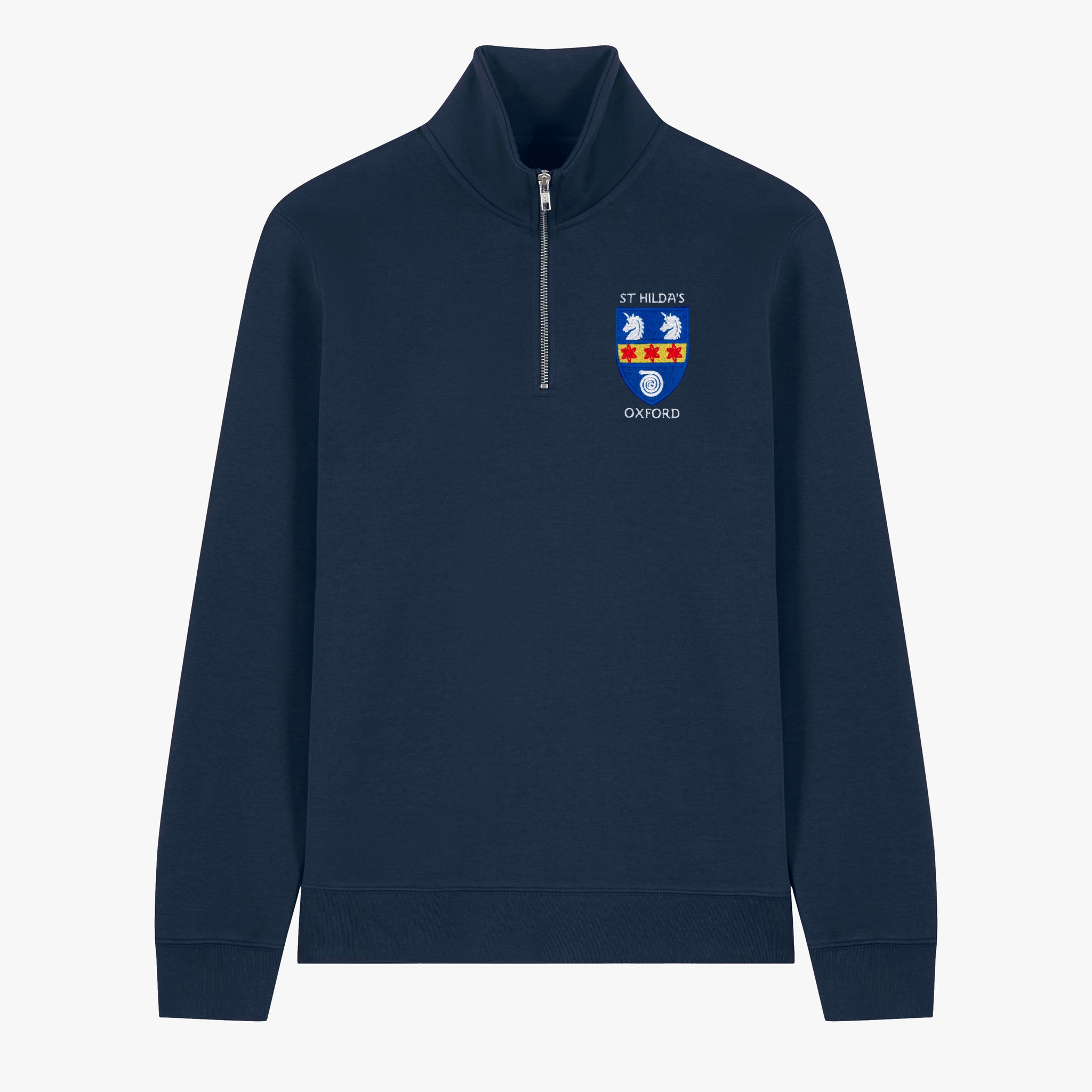 Evoking the quiet elegance of traditional collegiate attire, this quarter-zip sweatshirt offers a warm, refined layer for everyday life in and around Oxford. Its soft, weighty fabric and classic silhouette feel reassuringly timeless, while the stand collar and subtle ribbed detailing add a touch of old-world charm. Finished with an embroidered Oxford college crest on the left chest, it carries the character and heritage of the University with understated pride.